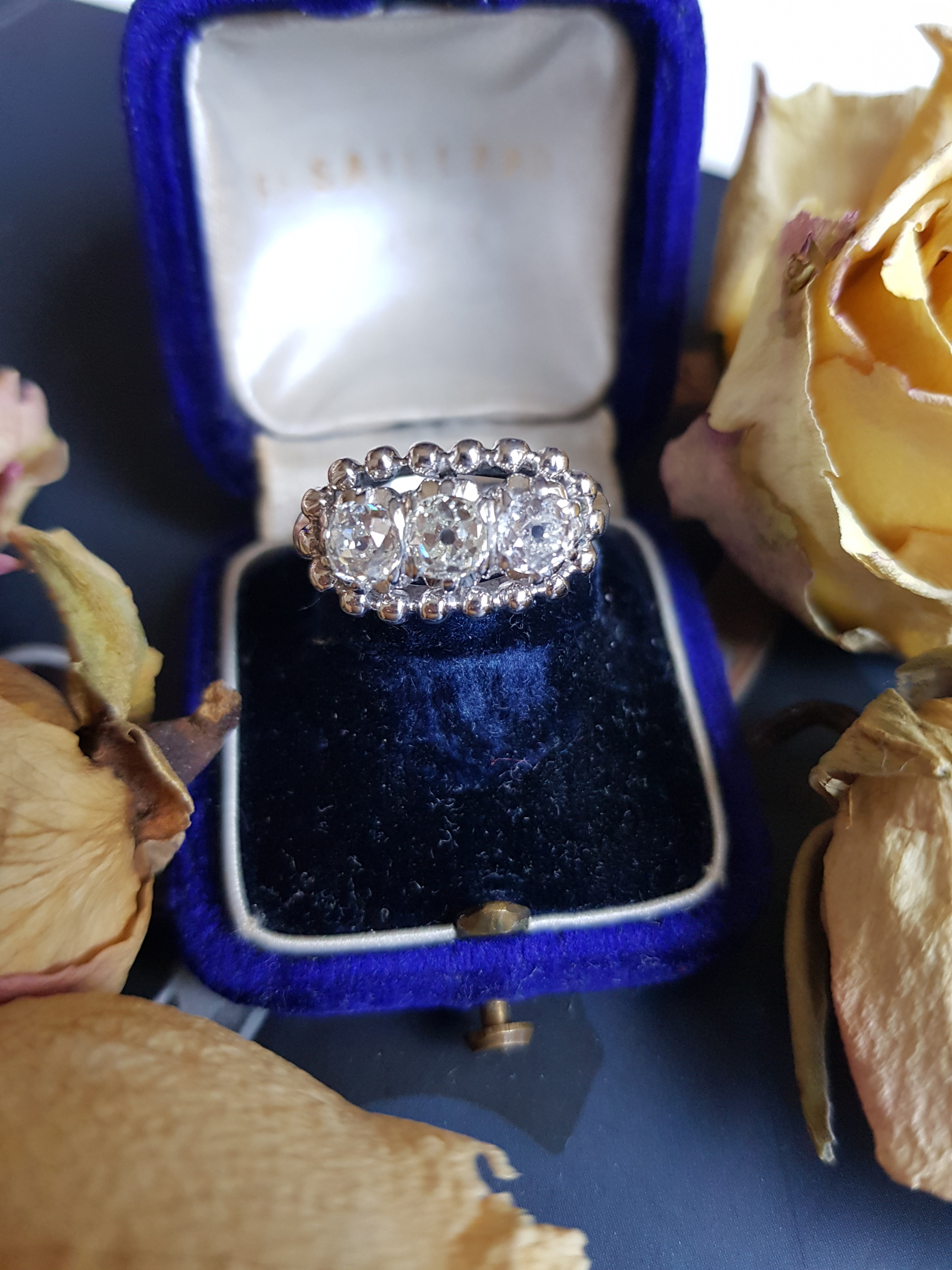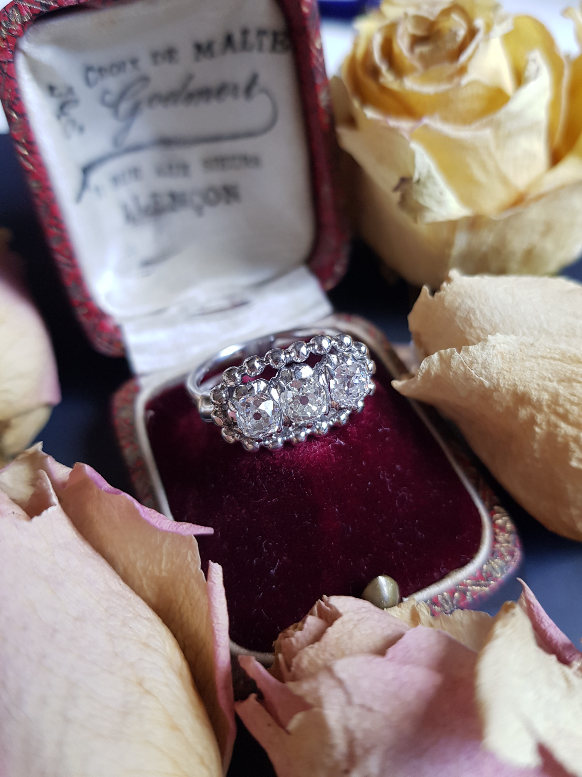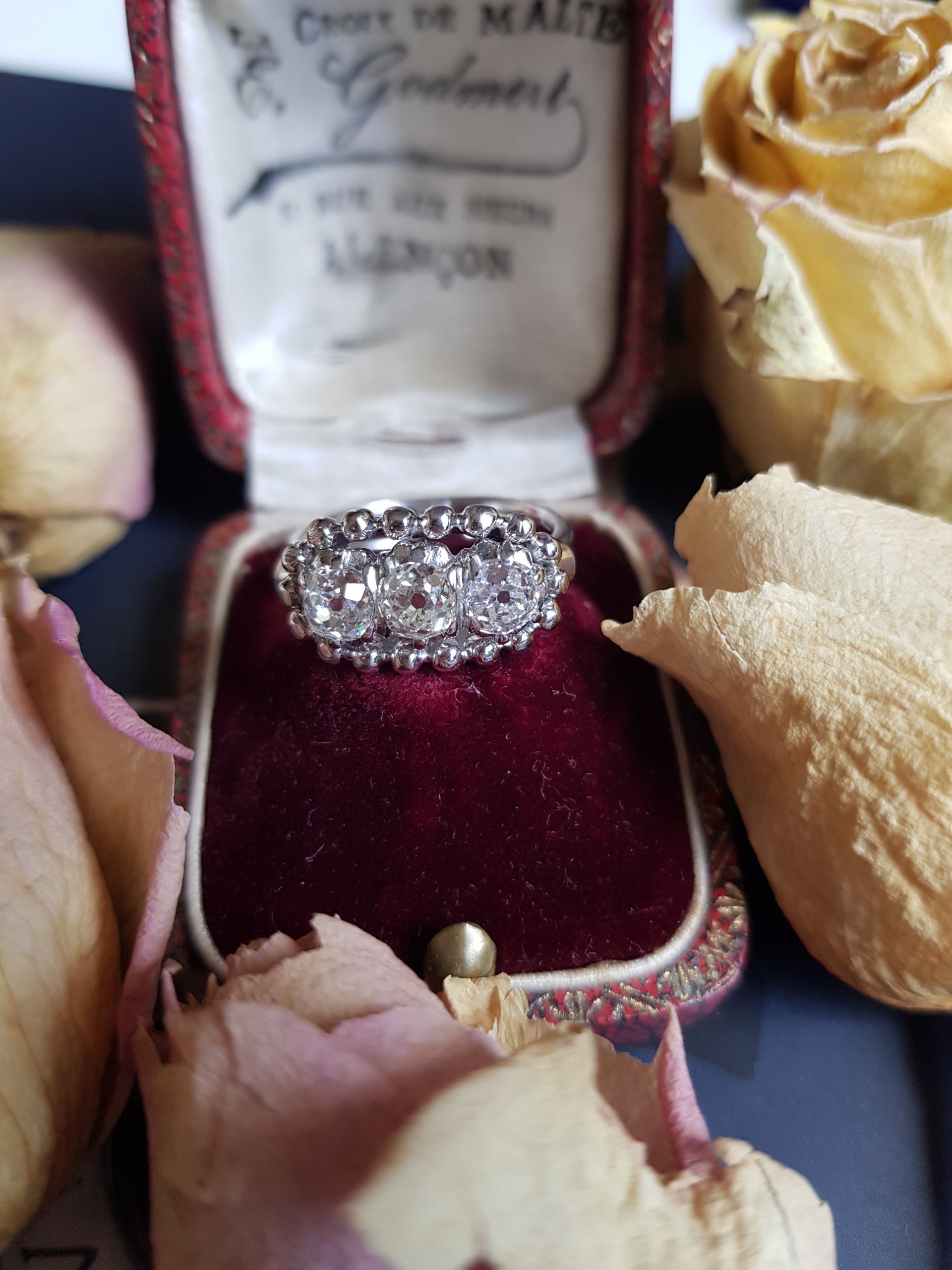 Pierres : Diamants taille ancienne dont le plus important au centre d’environ 0.6 – 0,7 carat.