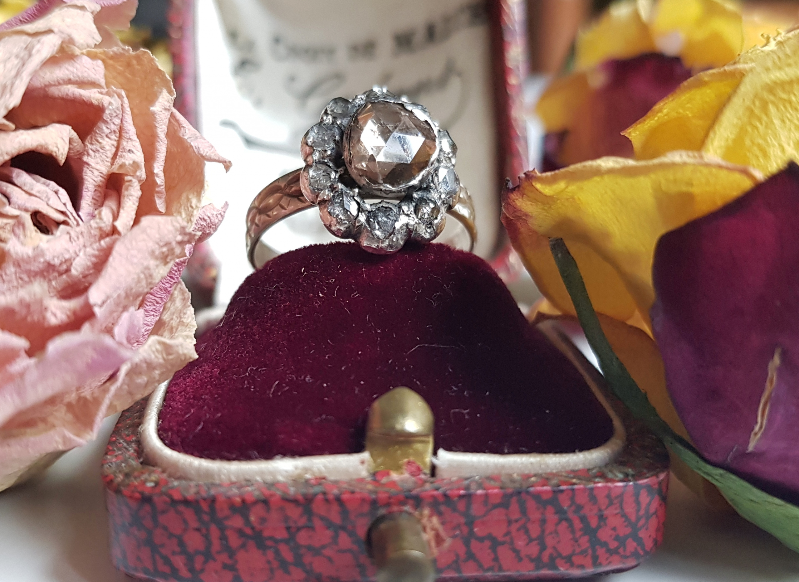 Stones : Diamonds rose cut . The main in the center is around 1.5 carat and of a cognac colour.